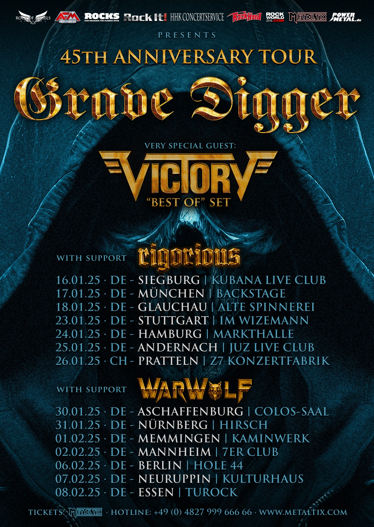 In January and February 2025, GRAVE DIGGER will pop the corks and celebrate their 45 years of band existence with you on their "45th Anniversary Tour". They will be supported by none other than Metal greats VICTORY as well as RIGORIOUS (from January 16th to January 26th, 2025) and WARWOLF (from January 30th to February 8th, 2025).